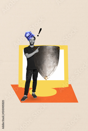 Fototapeta premium Exclusive image vertical photo collage of happy soldier man wear steel helmet protection shield point exclamation mark pc monitor