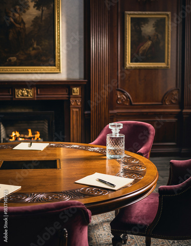 © SolaruS, Obraz premium Exclusive meeting room with round table, ready for negotiation. Warm light, classic style. Perfect for finance, leadership, strategy, or design concepts.