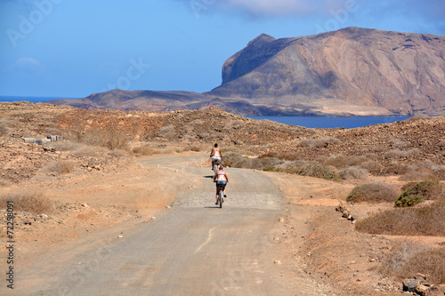 Naklejka premium excursionistas en bicicleta en la isla graciosa, lanzarote