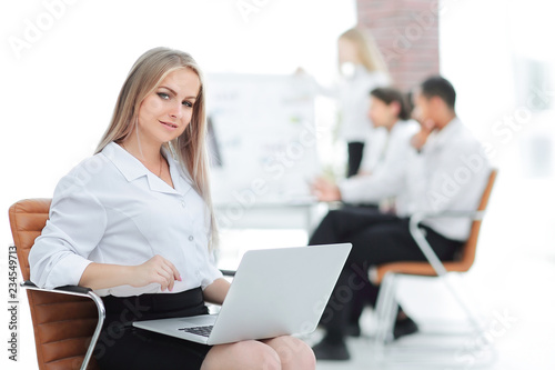 Obraz premium Executive business woman with a laptop on blurred background