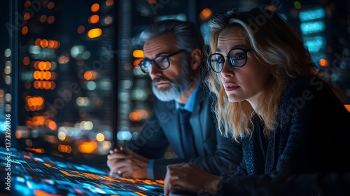 Obraz premium Executives collaborating in a high-rise office with a tech-inspired background.