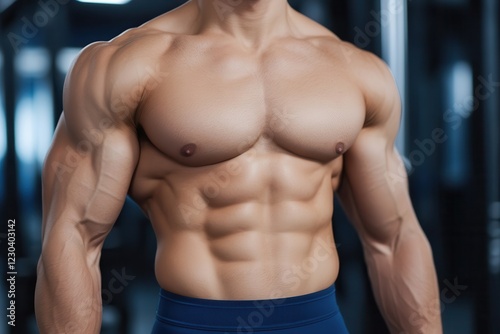 © artchvit, Fototapeta premium Exercise drives weight loss progress. Muscular male torso showcasing defined abs and chest muscles.