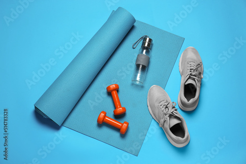 Naklejka premium Exercise mat, dumbbells, shoes and bottle of water on turquoise background,...