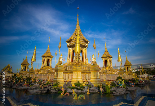 Naklejka premium Exhibition on royal cremation ceremony,Sanam Luang Ceremonial Ground,Bangkok,Thailand on November25,2017: Royal Crematorium for the Royal Cremation of His Majesty King Bhumibol Adulyadej