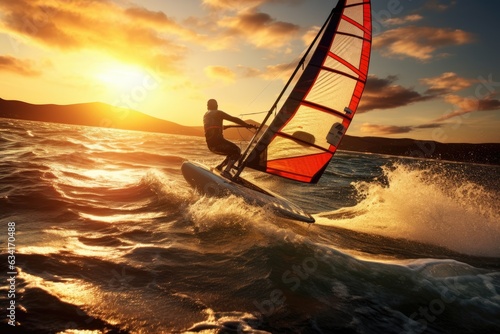 © YouraPechkin, Naklejka premium Exhilarating experience of windsurfing from a first-person perspective.