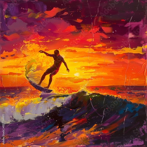 Naklejka premium Exhilarating sunset surfing scene, surfers catching waves, vibrant sky, dynamic motion, dramatic colors