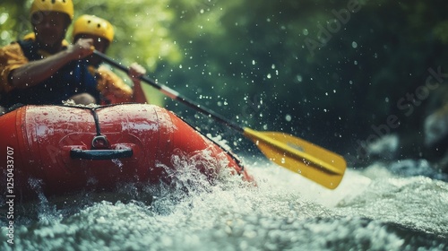 © uswatun, Naklejka premium Exhilarating White Water Rafting Adventure: Teamwork and Thrills on the River