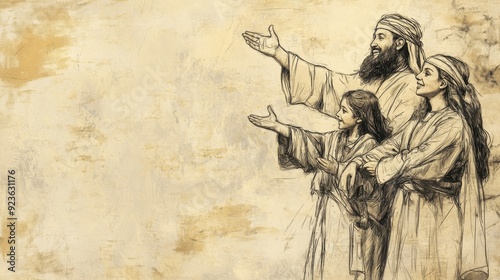 Fototapeta premium Exodus:Consecration of the Firstborn,Joyful Israelite Family Thanks God for Firstborn, Uplifted Hands - Biblical Illustration, Bible Wall Art, Beige Background - Consecration of Firstborn