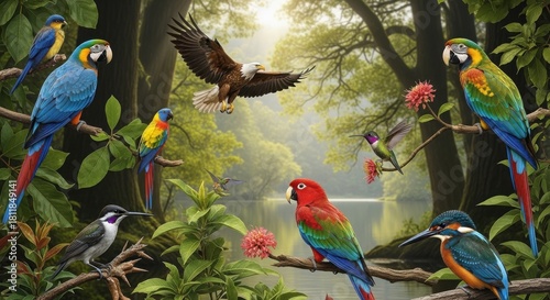 Fototapeta premium Exotic avian assemblage: A vibrant tapestry of birds in lush paradise setting