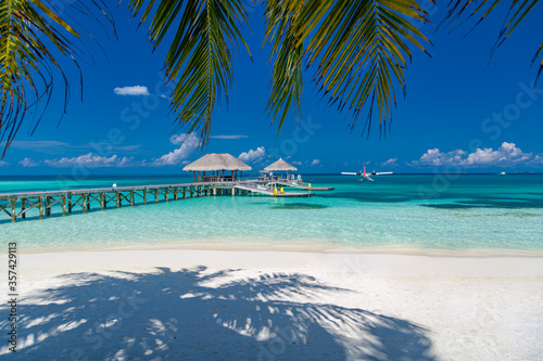 © icemanphotos, Naklejka premium Exotic beautiful beach. Jetty on the sandy beach near the sea. Summer holiday and vacation concept for tourism. Inspirational tropical landscape. Tranquil scenery, relaxing beach, tropical landscape