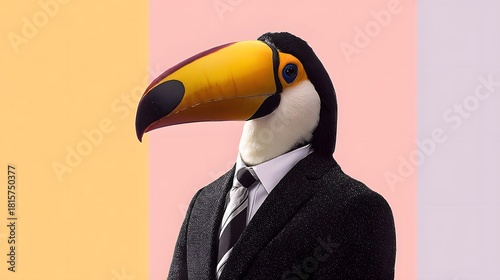 © sungedi, Fototapeta premium Exotic bird wearing formal business attire stands against a split pastel background