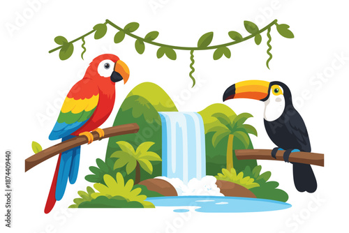 Fototapeta premium Exotic birds and jungle waterfall scene with colorful parrot and toucan