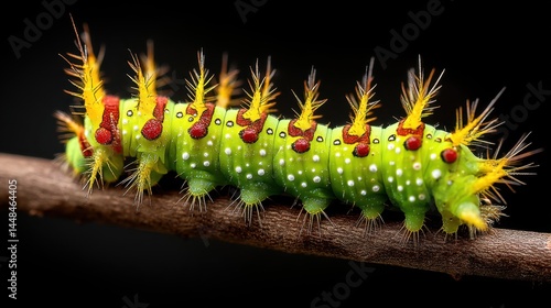 © riverdhan, Naklejka premium Exotic Caterpillar on Twig: Vibrant Nature Detail