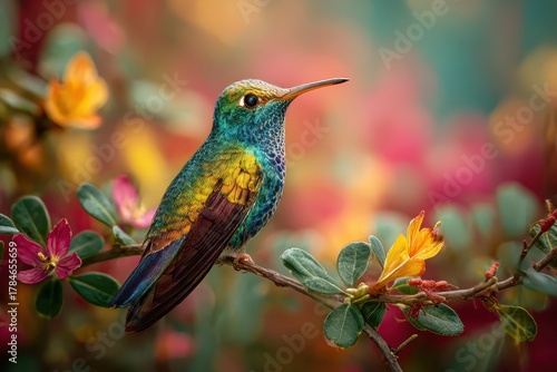 © Ifti Digital, Fototapeta premium Exotic colibri hummingbird perched gracefully on a vibrant tropical flower in a lush garden setting