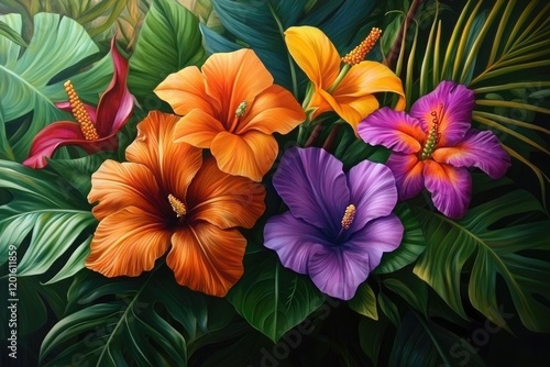 Fototapeta premium Exotic floral arrangement with rich colors, highlighted in a tranquil garden
