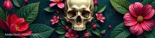 Naklejka premium Exotic flowers and foliage entwined around a dramatic human skull, floral...
