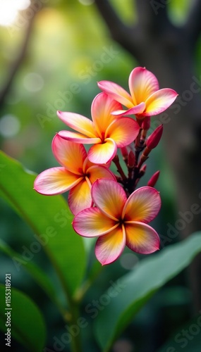 Fototapeta premium Exotic frangipani flowers hanging from the branches, flower, frangipani,...