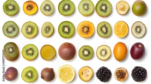 © puji, Fototapeta premium Exotic Fruit Slices with White Background.