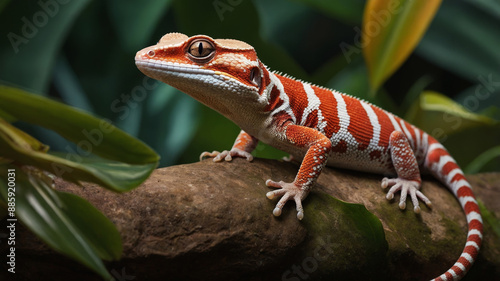 © HappyDesignWorlds, Obraz premium Exotic Gecko Resting Amidst Lush Foliage