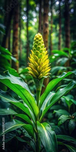 © Naowarat, Fototapeta premium Exotic green plant blooms unusual flower in dark humid forest environment