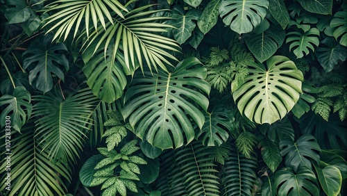 Fototapeta premium Exotic jungle foliage with various tropical plants and leaves arranged in a...