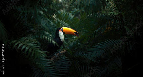 © vxnaghiyev, Fototapeta premium Exotic keel billed toucan highlighted in dense tropical greenery during nature travel