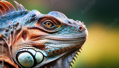 Fototapeta premium Exotic Lizard: A vibrant close-up of an iguana showcases its textured skin and captivating eye, set against a soft, out-of-focus background.