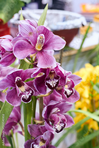 Obraz premium exotic looking, vibrant hued cymbidium (boat orchids) flowers, a genus of evergreen flowering plants in the orchid family Orchidaceae.