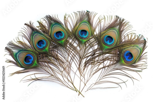 © Isuru, Obraz premium Exotic peacock feathers on white background with copy space.