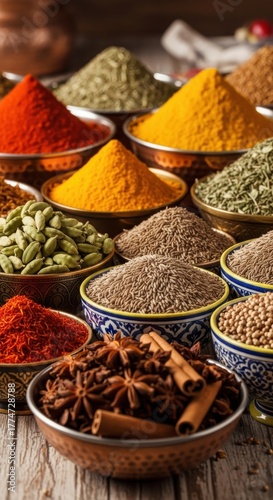 © Aisa, Fototapeta premium Exotic spices in colorful bowls create an aromatic and flavorful display showcasing cooking