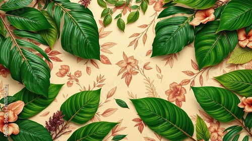 © Sathaporn, Fototapeta premium Exotic tropical leaves scattered on beige and brown floral background, abstract, foliage