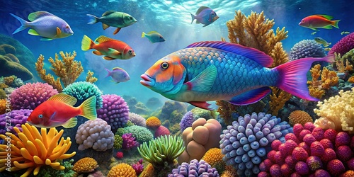 Fototapeta premium Exotic underwater scene of a parrotfish eating corals in the Red Sea