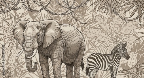 Naklejka premium Exotic Wildlife Illustration: Elephant and Zebra in Tropical Forest Artwork