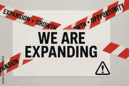 © stickerside, Fototapeta premium Expansion announcement with WE ARE EXPANDING and bold opportunity promo, dynamic caution tape style, clear growth retail offer.