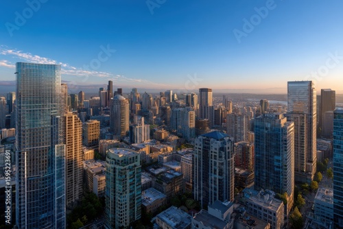 © Pixan, Naklejka premium Expansive aerial view of a modern city skyline bathed in the warm glow of sunrise with clear blue sky