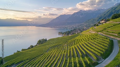 © Puttipong, Fototapeta premium Expansive aerial view of Montreuxs vineyards, forming a stunning pattern on the slopes leading to the serene Lake Geneva.