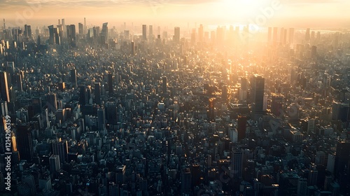 © Khukrit, Obraz premium Expansive and Geometric Cityscape with Sunlight Highlighting Sleek Structures