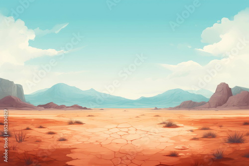 © Gun, Naklejka premium Expansive Arid Desert with Cracked Earth and Distant Blue Mountains Under a Clear Sky
