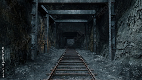Fototapeta premium Expansive Coal Mining Operation in Dark Underground Tunnel with Steel Tracks