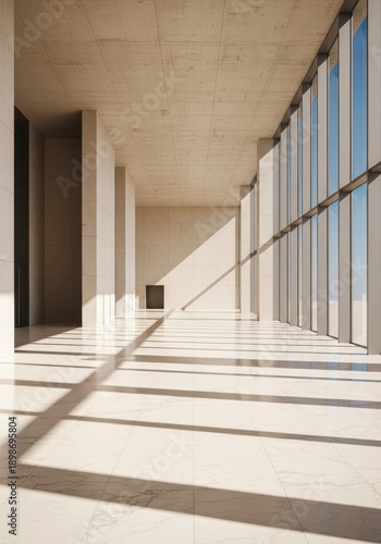 © dadtophoto, Obraz premium Expansive, contemporary building foyer featuring high ceilings, polished marble floors, and ample natural light, emphasizing spaciousness and tranquility, glass, empty, structure