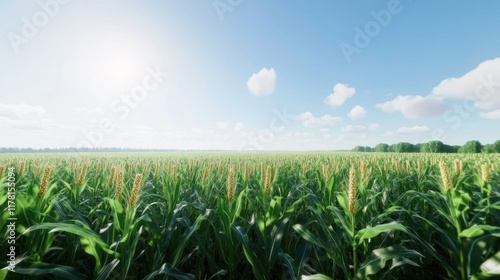 © Muhammad, Obraz premium Expansive cornfield under a bright sky with fluffy clouds.