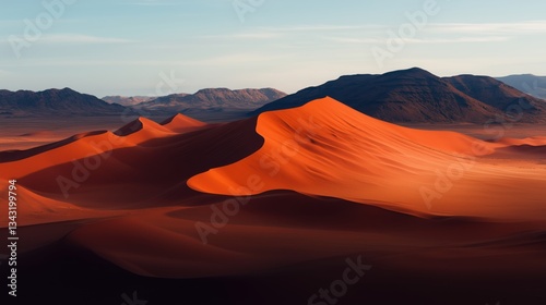 Naklejka premium Expansive desert dunes with deep shadows and warm light, showcasing a tranquil, vast landscape of sand and mountains.