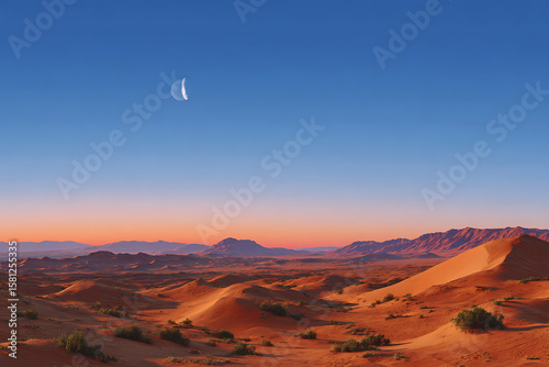 Fototapeta premium Expansive Desert Landscape at Sunset with Rolling Sand Dunes and a Crescent Moon in a Vivid Blue Sky Orange and Red Hues Dominate the Sand