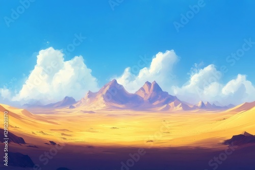 Fototapeta premium Expansive desert landscape featuring golden sand dunes and a brilliant blue sky, with distant mountains and fluffy white clouds enhancing the scene
