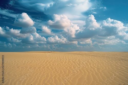 © Azadart, Naklejka premium Expansive desert landscape under a bright blue sky with majestic mountains and soft clouds in a distant horizon during daytime
