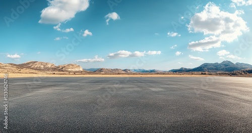 © ANUAR, Fototapeta premium Expansive Desert Landscape with Clear Blue Sky, Cloud Puffs, and Scenic Mountains Under Bright Sunlight during Daytime