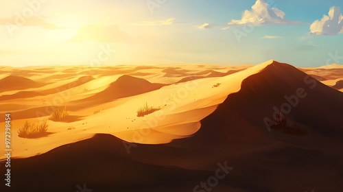 © tantawat, Naklejka premium Expansive Desert Landscape with Golden Glow and Sweeping Sand Dunes