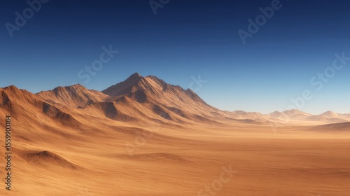 Naklejka premium Expansive Desert Landscape with Majestic Mountains Under a Clear Blue Sky at...
