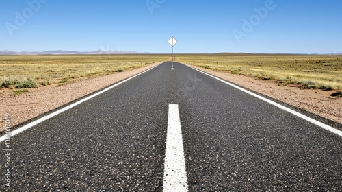 Fototapeta premium Expansive Desert Road Stretching Under Clear Blue Sky with Directional Sign on Horizon in Remote Landscape