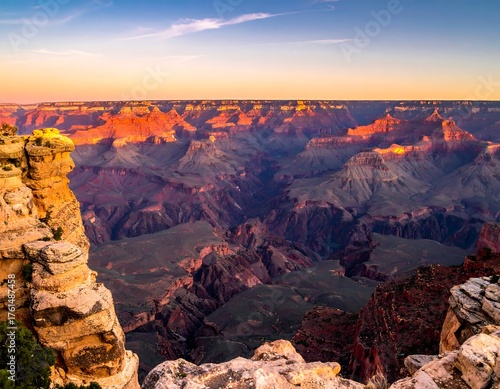 © elara, Obraz premium Expansive desert vista at sunrise, showcasing layered sandstone cliffs and deep canyons under a gradient sky